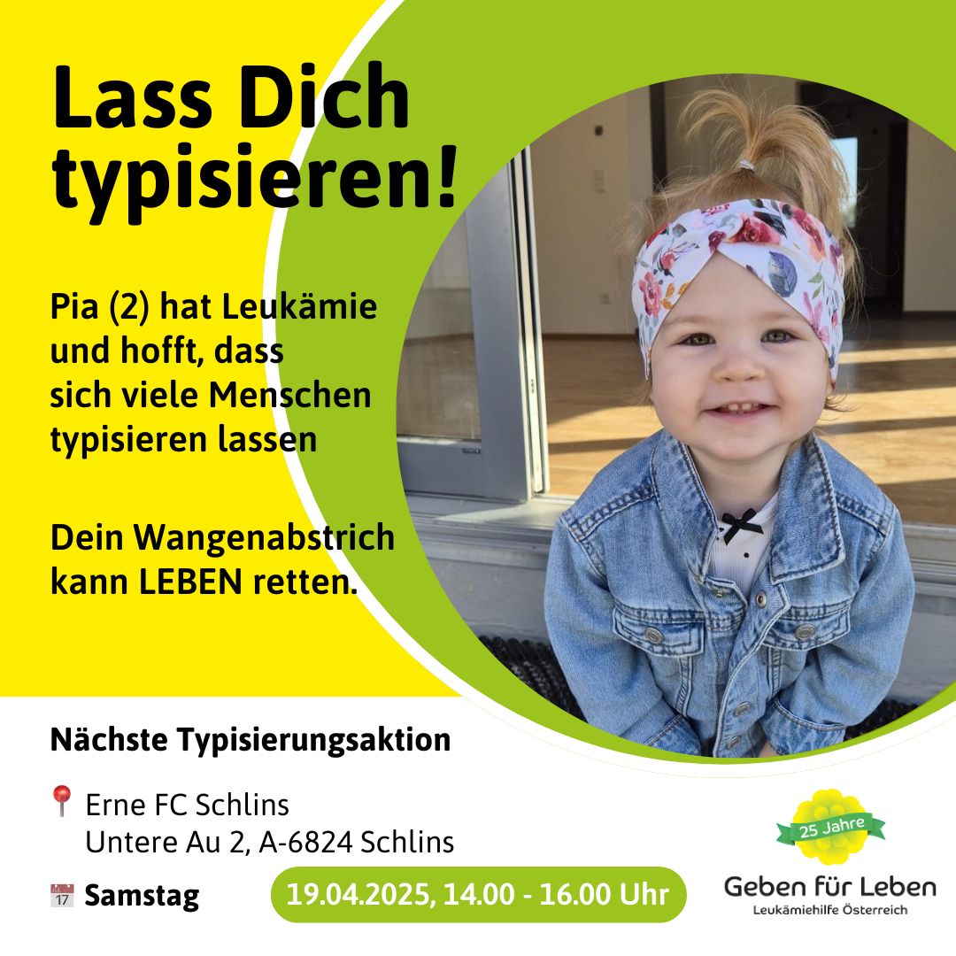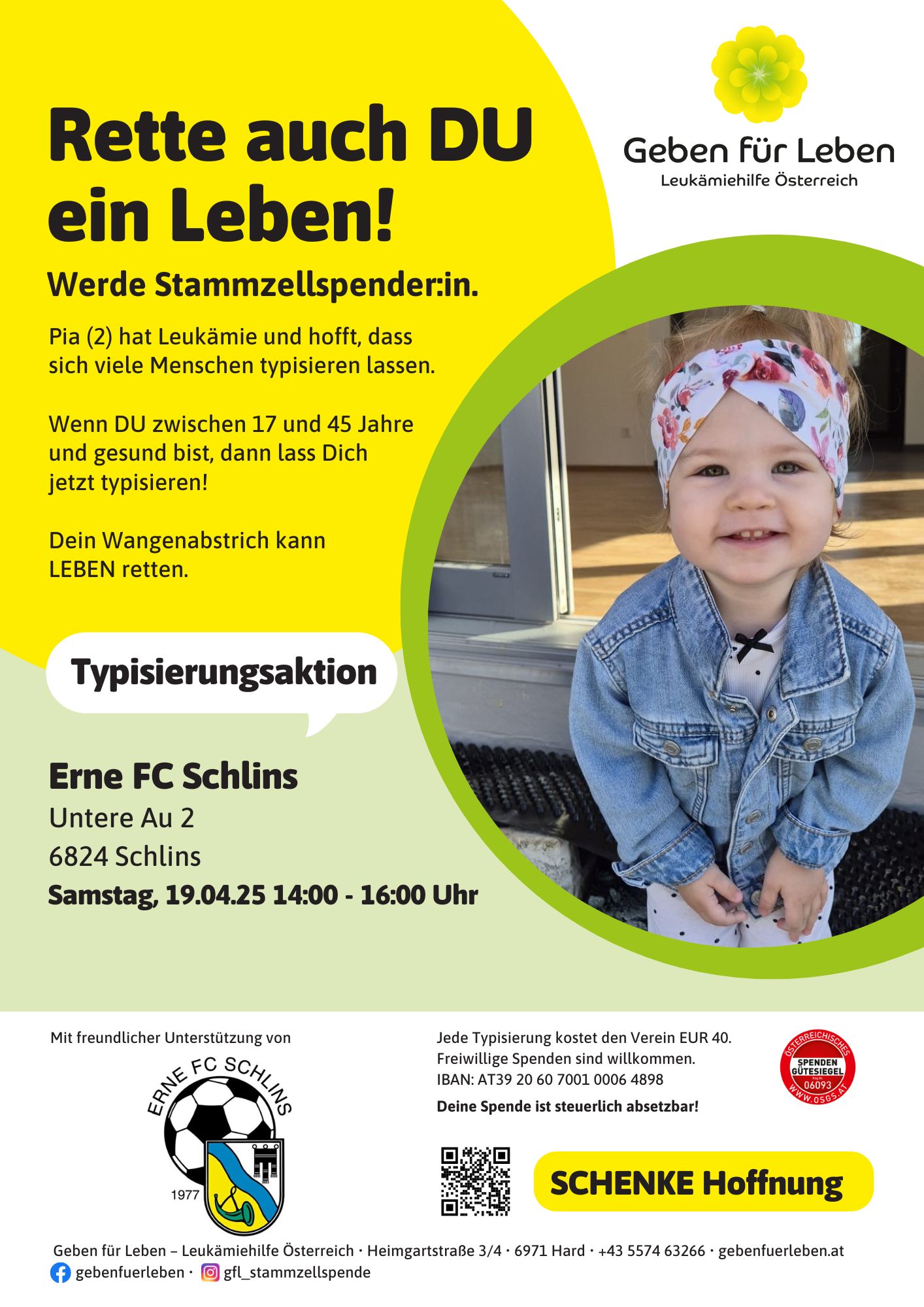 Am 19. Apri 2025 von 14:00 bis 16:00 Uhr besteht die Möglichkeit sich beim Heimspiel des FC Erne Schlins zu typisieren