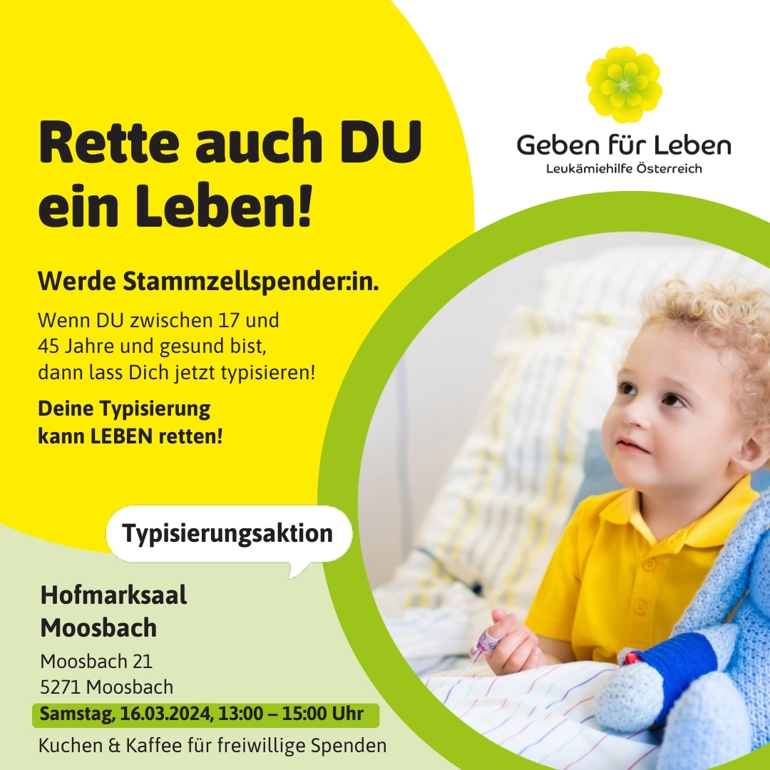 16. März 2024 von 13:00 - 15:00 Uhr im Hofmarksaal Moosbach, Kuchen und Kaffeebuffet für freiwillige Spenden - Download Plakat