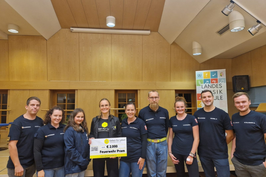 Titelbild: Mitglieder:innen der Feuerwehr Pram mit Kristina Fenninger (GfL) bei der Scheckübergabe –