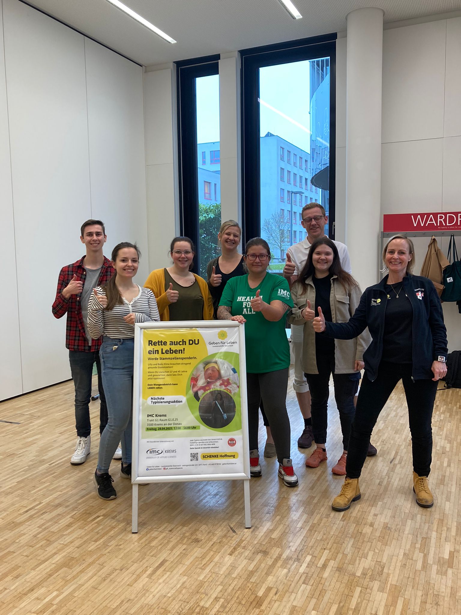Herzlichen Dank für die wertvolle Unterstützung der IMC Fachhochschule Krems über € 1.000.- und die € 120,- aus der Spendenbox! Ein großes Dankeschön auch an alle freiwilligen HelferInnen für die tolle Unterstützung bei der Typisierung.