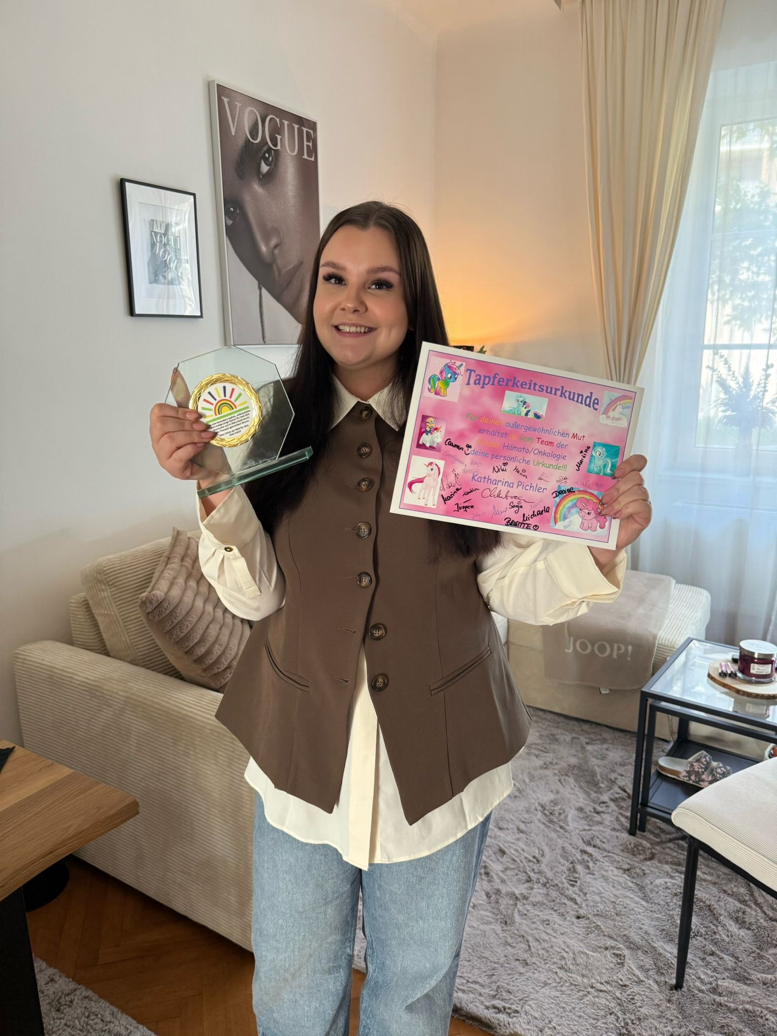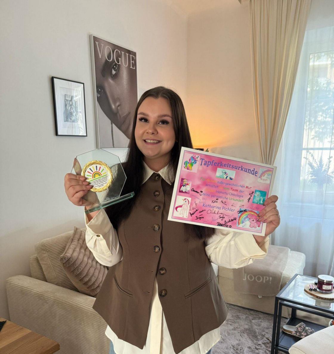 Titelfoto: Katharina mit ihrer Tapferkeitsurkunde und ihrem Pokal.