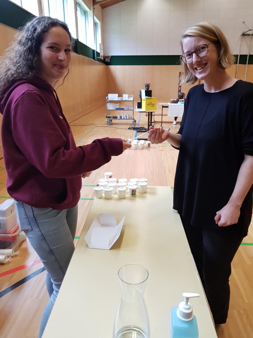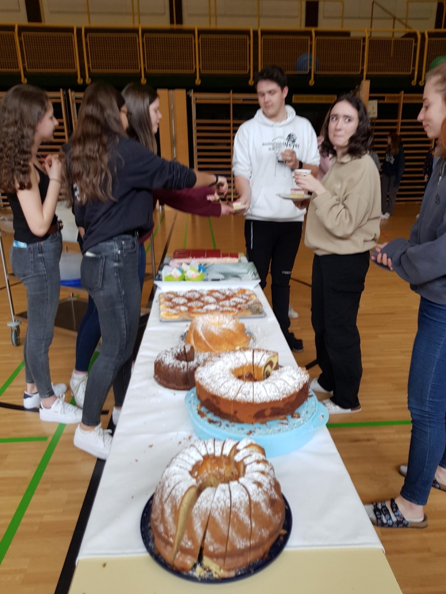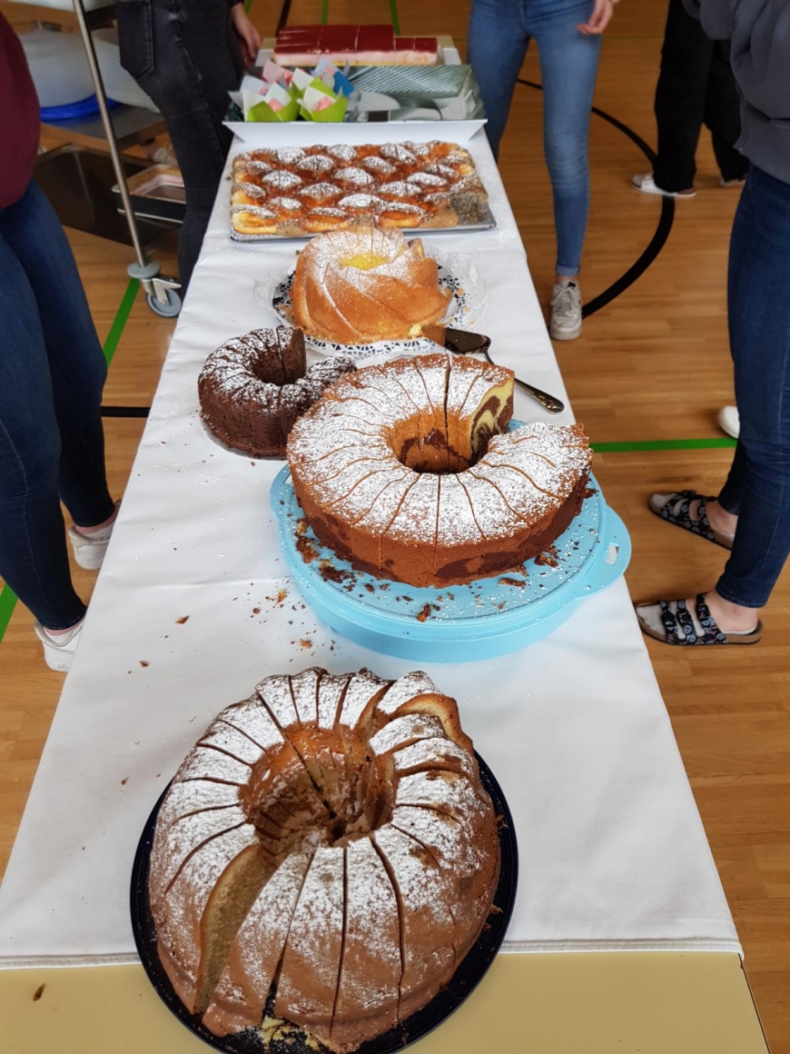 Im Turnsaal der Schule wurden ein paar Tische und Sessel im Stationenbetrieb aufgebaut. Ein herrliches Kuchenbuffet rundete das Event am Nachmittag ab. Der Erlös aus dem Buffet über € 221,60 kommt „Geben für Leben“ zugute, um weitere Typisierungen finanzieren zu können.