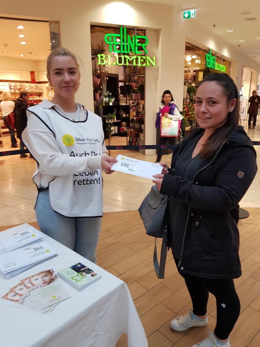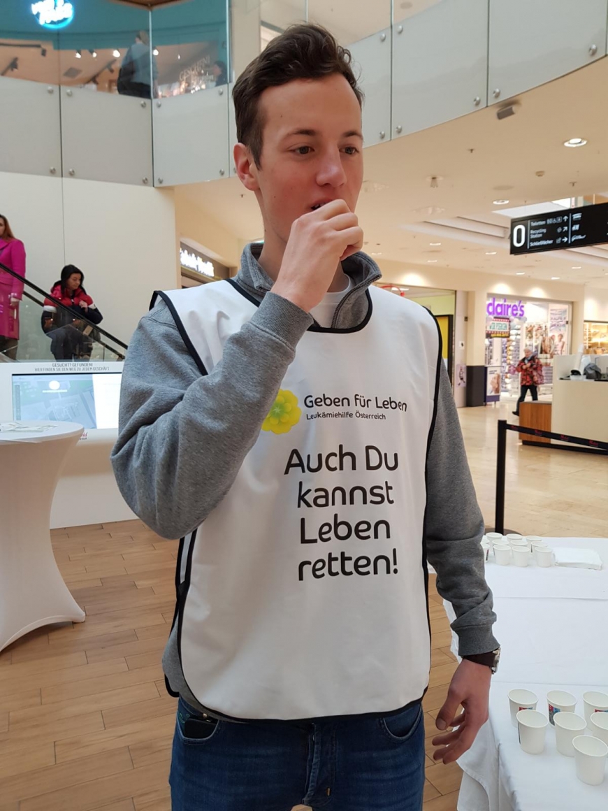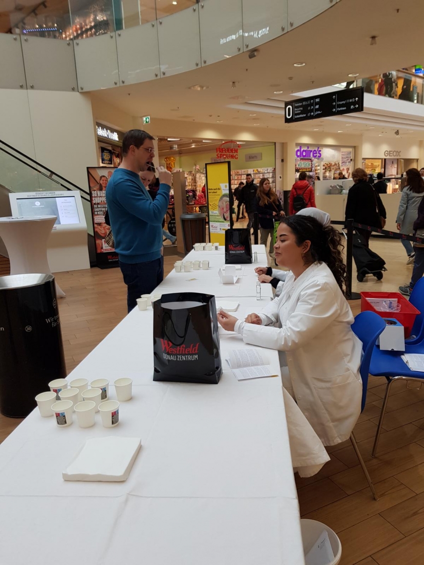 Für jede abgegebene Typisierung gab es als Dankeschön eine € 5,- Gutscheinkarte vom Westfield Donau Zentrum. Der Gutschein konnte auch gleich wieder gespendet werden, was ein Drittel auch gemacht hat. Aus der Spendenbox kamen nochmals € 246 zusammen, die für weitere Typisierungen eingesetzt werden.