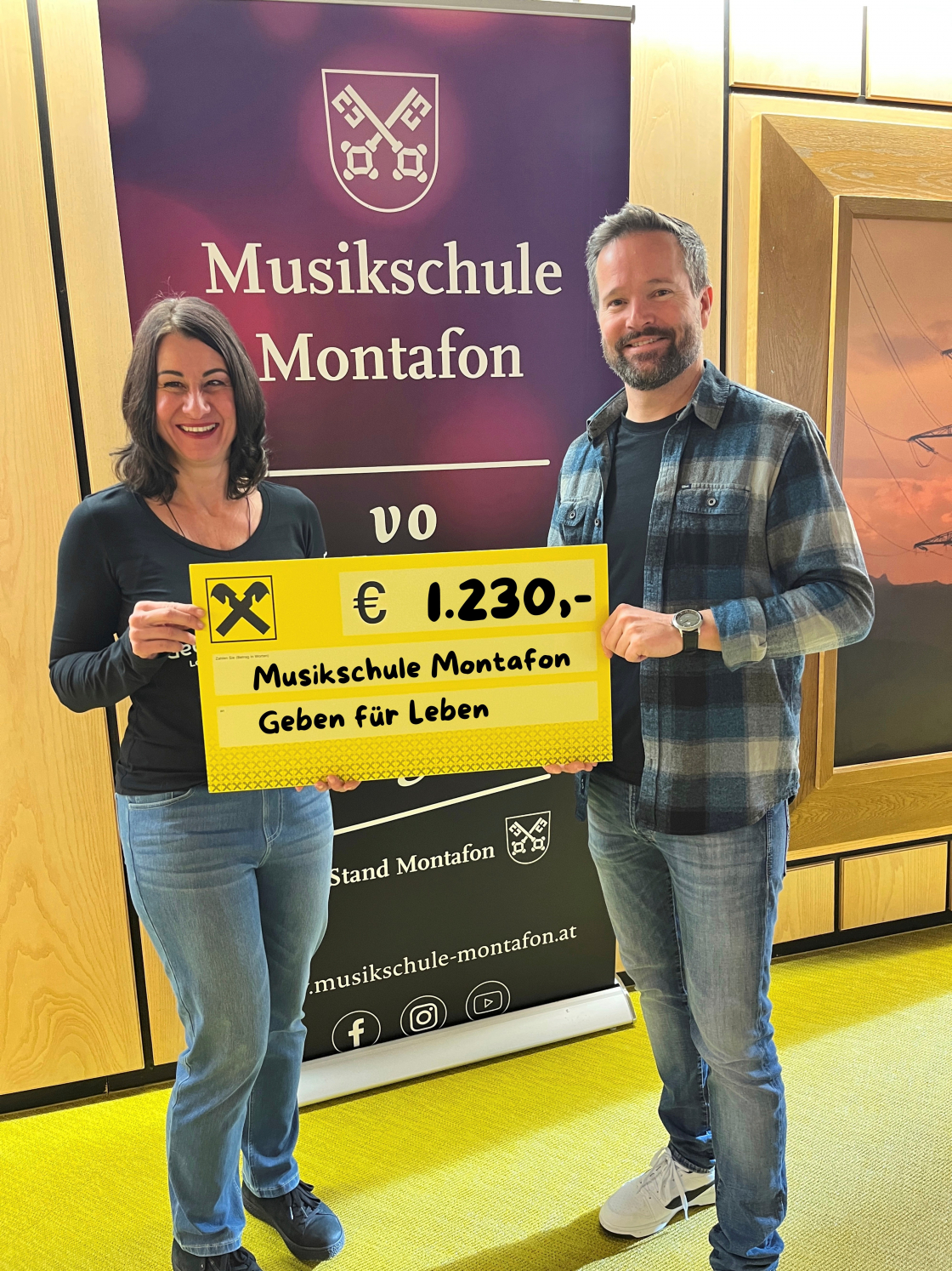 Ralph Hollenstein, Direktor der Musikschule Montafon, überreichte mit großer Freude eine Spende in Höhe von € 1.230 an Susanne Marosch vom Verein Geben für Leben – Leukämiehilfe Österreich.
