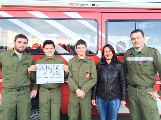 Ende Dezember kam die Feuerwehrjugend aus Möggers auf mich zu und überreichte mir einen Scheck über den stolzen Betrag von € 1.225,-, den sie bei einer Friedenslichtaktion für Lukas aus Doren gesammelt haben, der an einer seltenen Blutkrankheit leidet und dringend einen Stammzellspender braucht.