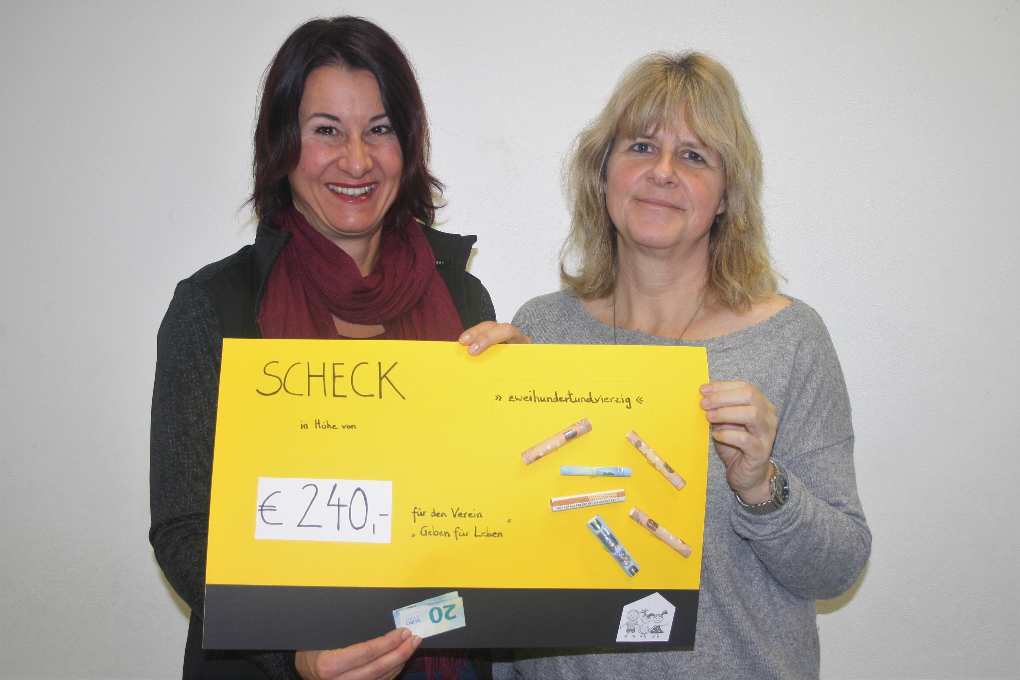 Bild: Susanne Marosch und Manuela Huber (Leiterin Kindergarten) bei der Scheckübergabe – Download Foto