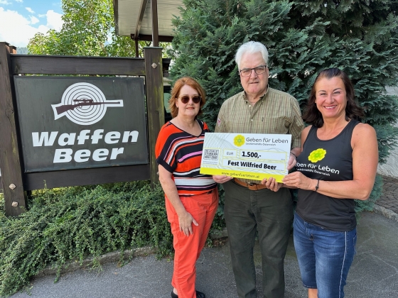 Wilfried Beer vom "Jagd- und Sportwaffengeschäft Beer" in Bludenz feierte seinen Geburtstag. Anstelle von Geschenken bat er seine Gäste um eine Geldspende an unseren Verein "Geben für Leben". So kamen € 1.500,- zusammen, die er im Anschluss an Susanne Marosch (GfL) übergab.
