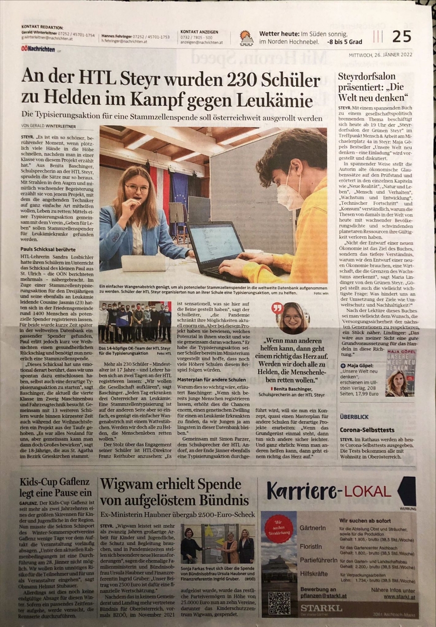 Nach einer Videokonferenz mit dem Verein "Geben für Leben – Leukämiehilfe Österreich" in den Weihnachtsferien veröffentlichten sie selbstgedrehte Aufklärungsvideos, die auf Youtube und Instagram @sv_htlsteyr großen Anklang fanden. „So war es uns möglich, an unserer Schule innerhalb von zwei Tagen unkompliziert unsere MitschülerInnen zu registrieren.“, schwärmt die Schulsprecherin stolz.