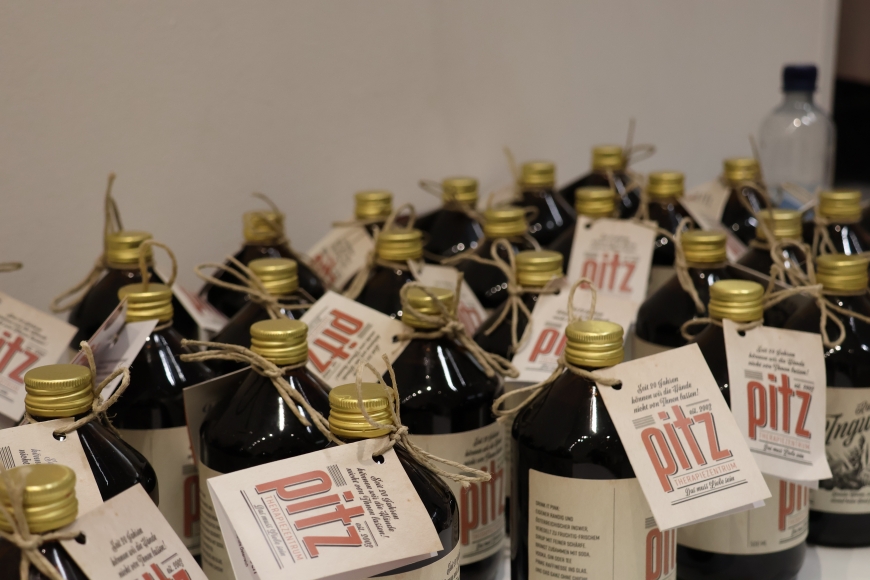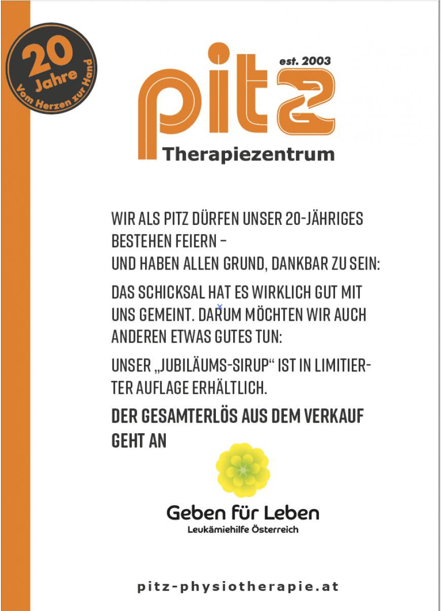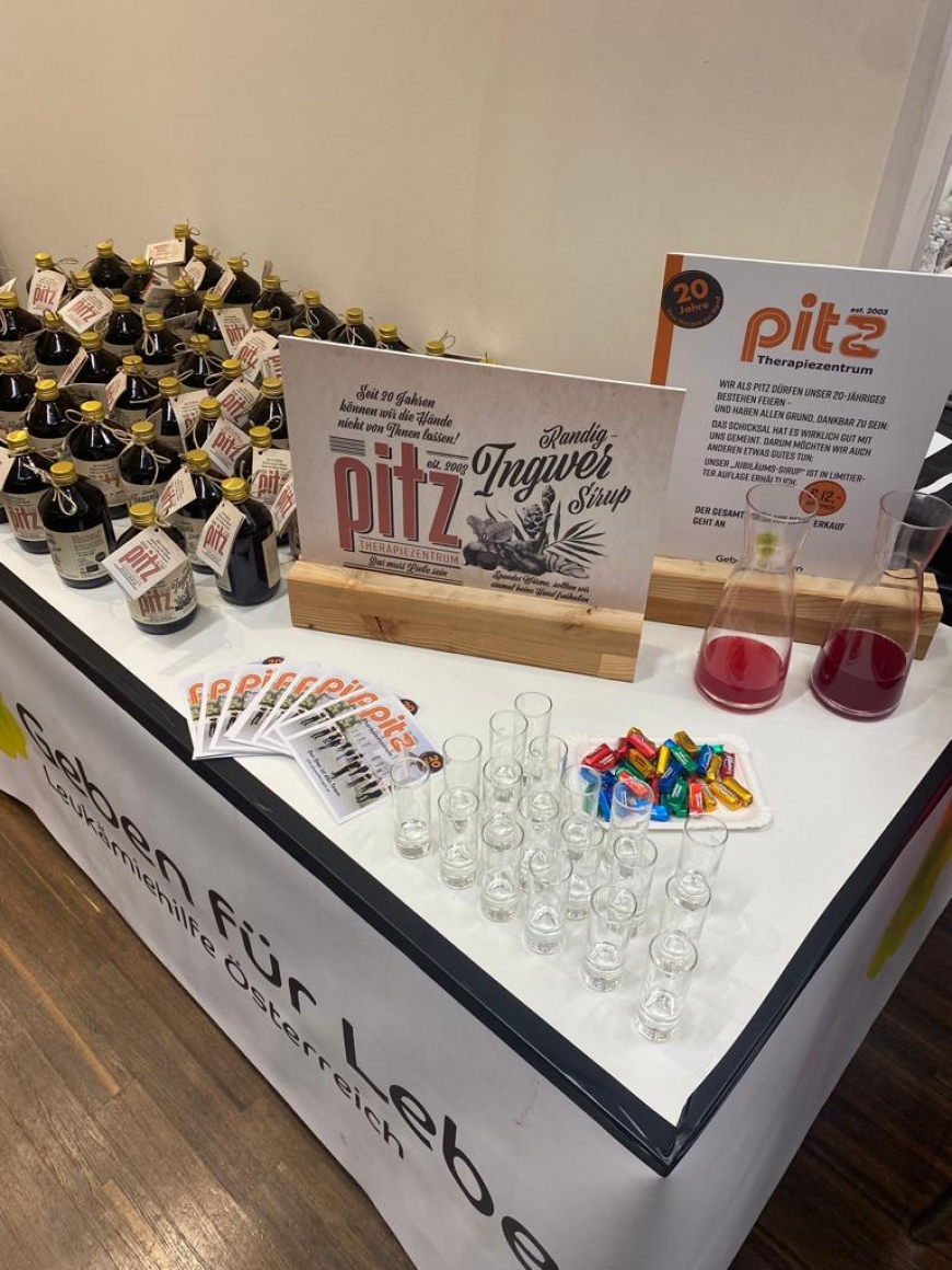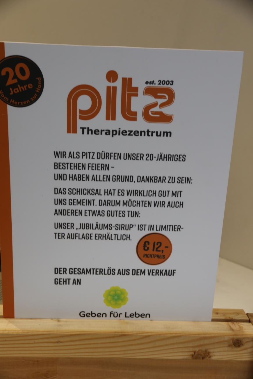 In der Alten Mühle am Dorfbach in Hard, dem beruflichen Zuhause von "Geben für Leben" und dem "PITZ", wird es daher auch zukünftig gegen ein Spendenentgelt ab € 12.- diesen hochwertigen Sirup zu erstehen geben. Denn der Sirup kann laut PITZ "als gesunde Alternative zu herkömmlichen Sirups als Heiß- oder Kaltgetränk mit oder ohne Sprudel oder Alkohol genossen werden.".