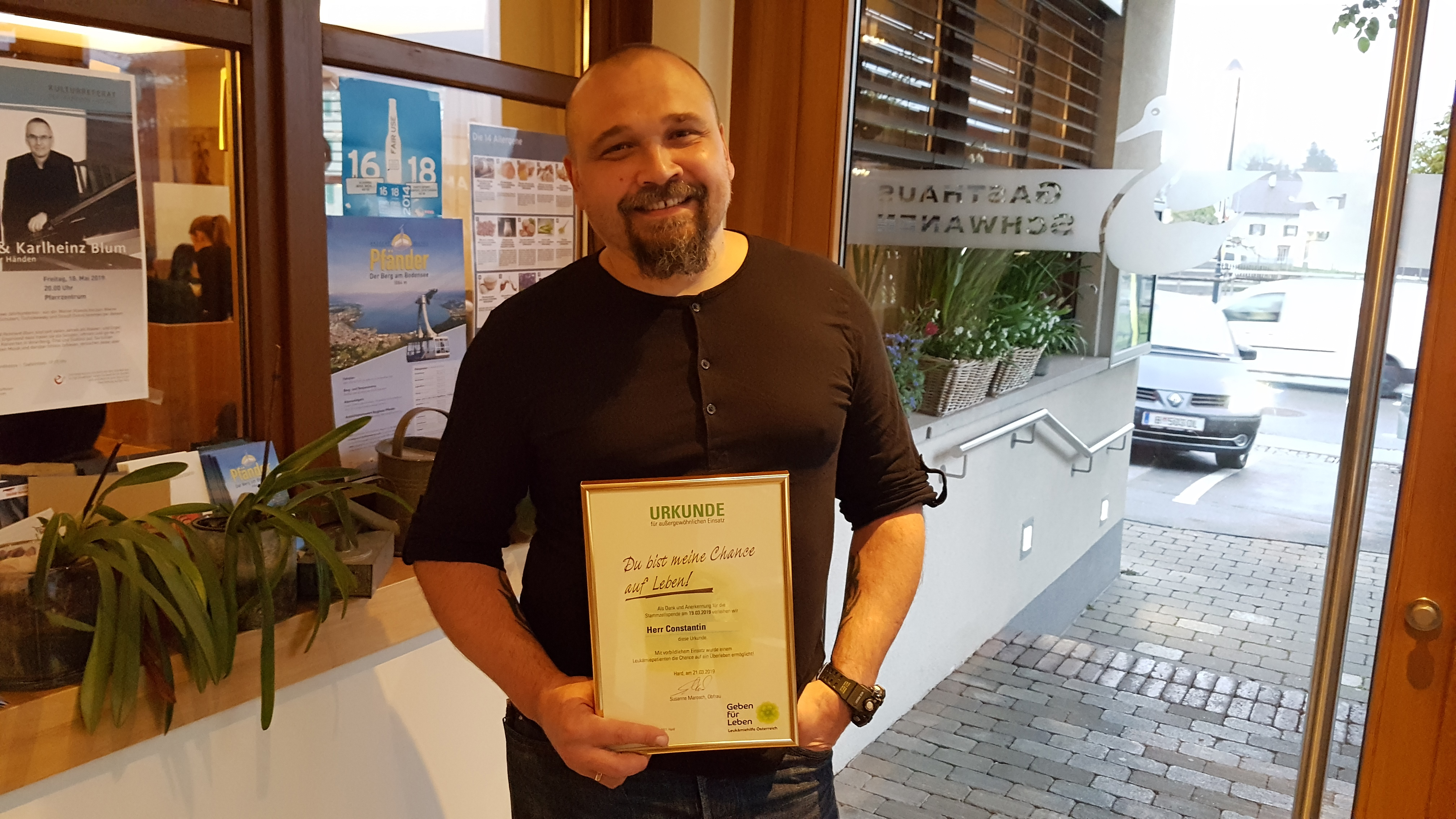 Vielen Dank Constantin für deinen großartigen Einsatz. Vielen Dank auch an den Arbeitgeber Flatz in Lauterach, der Constantin zu jeder Zeit unterstützt und dadurch die Spende möglich gemacht hat. Gemeinsam habt ihr einer jungen Frau aus Mitteleuropa und ihrer Familie wieder Hoffnung auf Leben geschenkt!