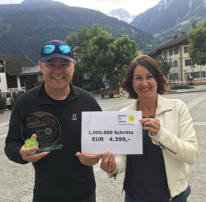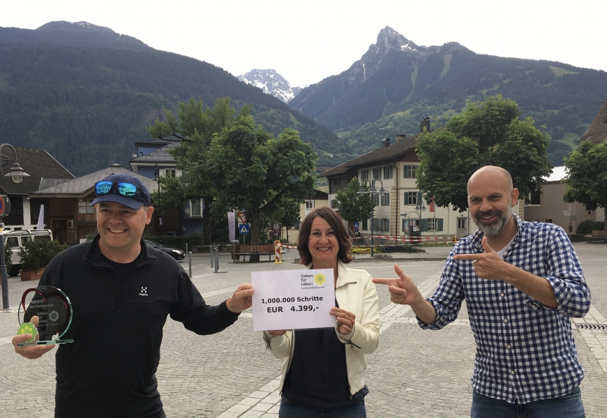 € 2.000,- spendete sein eigenes Unternehmen "Informer" und weitere Spenden kamen von seiner Familie und von Freunden. Wie zum Beispiel von seinem Freund Casper van Het Hof, der ihn 150.000 Schritte lang begleitete. Die Spenden überreichte er mir am 28. Mai in Schruns.
