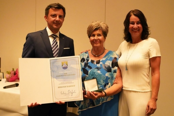 Bild: Bürgermeister Martin Staudinger mit Herlinde Marosch und Tochter Susanne – Download Foto (Foto: Frank Angerer, Gemeinde Hard)