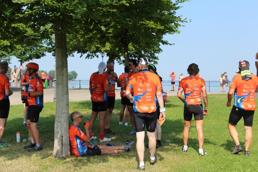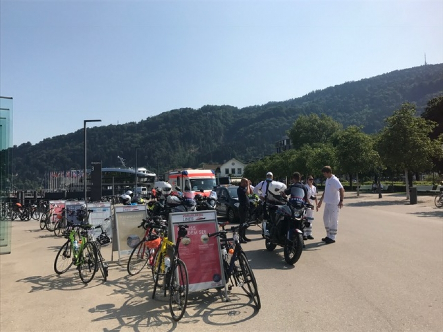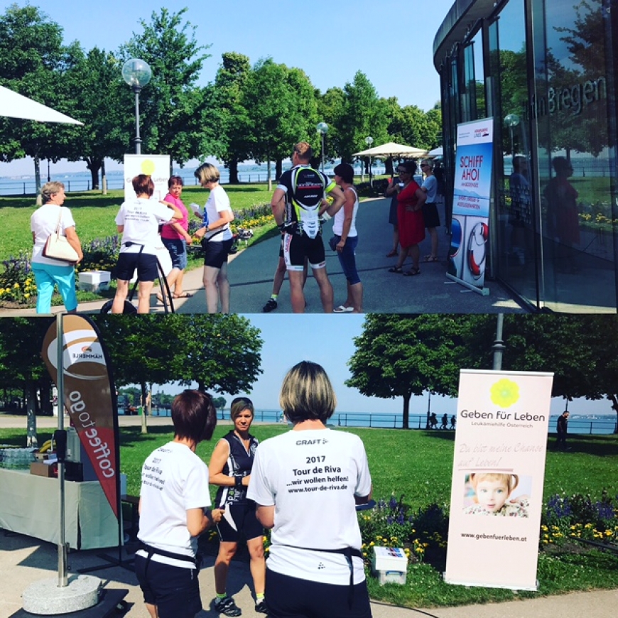 Bei Kaiserwetter und sehr hohen Temperaturen starteten die rund 100 Fahrer ihre Tagesetappe in Friedrichshafen. Den ersten Halt machten sie in Bregenz bei der "Welle", wo Gastgeber Bgm. Markus Linhart und das tolle Team der Welle sie bereits mit Erfrischungen und Snacks erwarteten. Kaffee und Tee wurden dabei von der Firma Hämmerle Kaffee gesponsert.