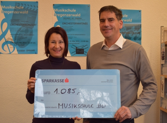 Bild: Susanne Marosch mit Urban Weigel (Direktor Musikschule) bei der Scheckübergabe - Download Foto