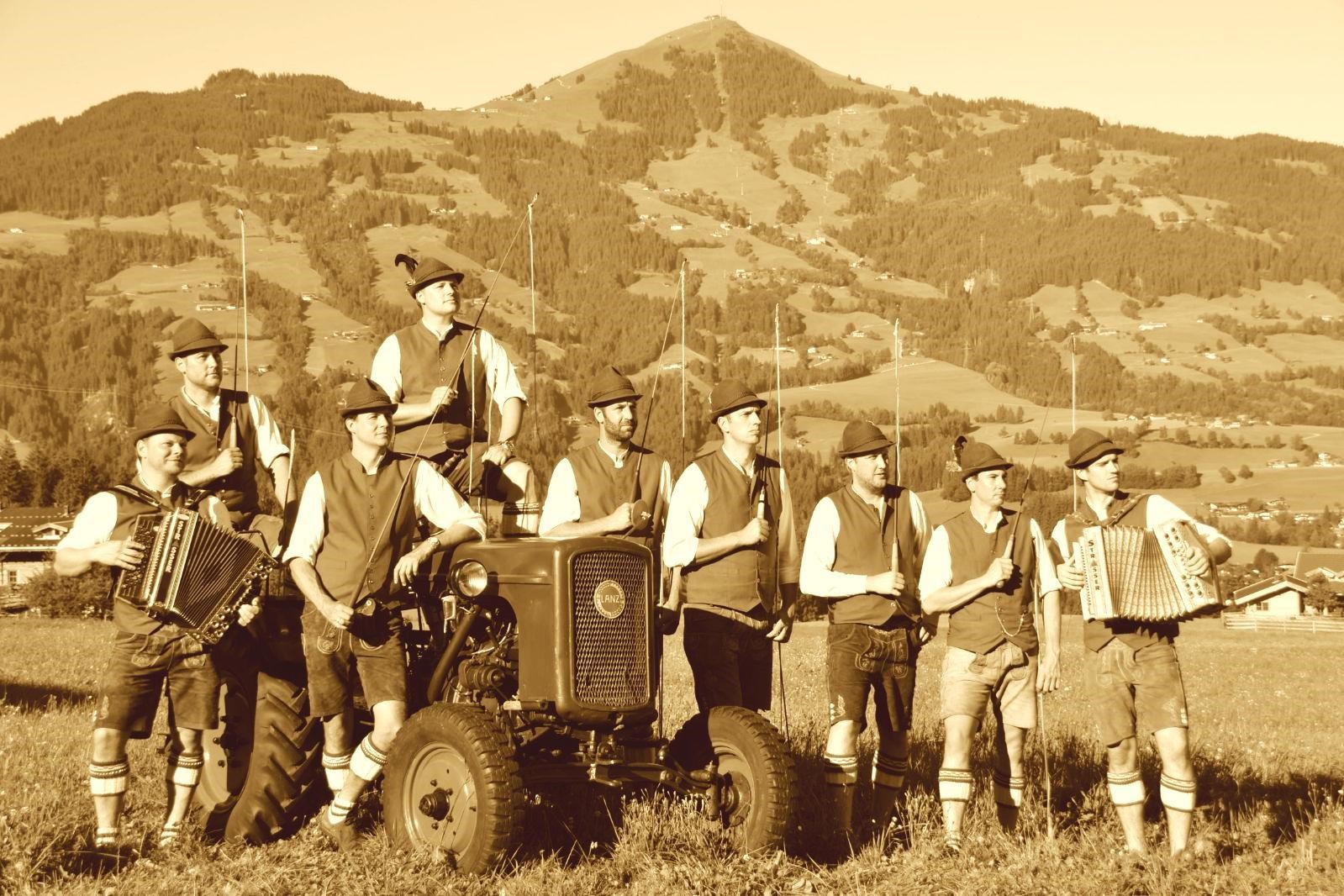 Bild: Die Mannen der Gruppe "Hopfgoschta Goaßlschnoiza" vor dem Hausberg von Hopfgarten, der Hohen Salve - Download Foto