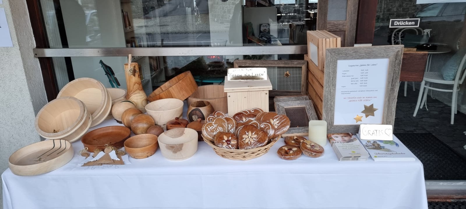 Einer der Stände wurde von Klaus Bilgeri und seinen sieben Marktmädels betreut. Klaus verkaufte seine selbstgemachten Drechselarbeiten und seine Frau Brigitte sorgte mit ihren Freundinnen für leckere Lebkuchen. So kamen stolze € 1.732,10 zusammen, welche an uns gespendet wurden.