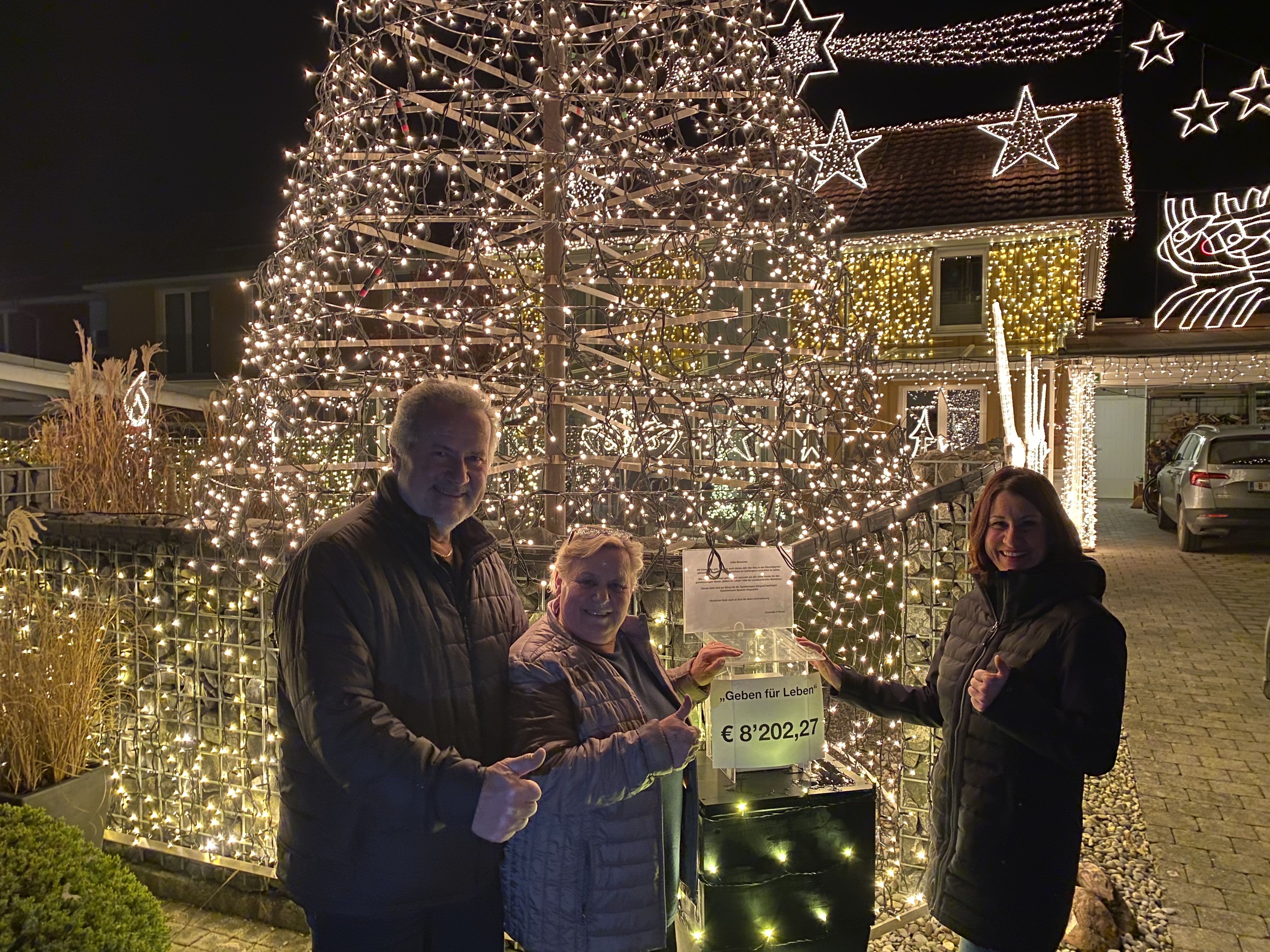 Zusätzlich stellten sie zwischen dem 28. November und dem 6. Jänner eine Spendenbox auf. Jeder, der die wunderschöne Beleuchtung genoss, konnte vor Ort eine Geldspende hineinwerfen. Am 7. Jänner überreichten mir Krimhilde und Remo den stolzen Betrag von € 8.202,27. Zusätzlich zur Spendenbox und den Genusspaketen sammelten sie über ihre Facebookseite noch einmal € 895,- für uns!