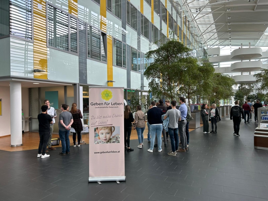 Im Foyer, nahe der Kantine, waren die Stationen gut sichtbar aufgebaut. Ein Pool an großartigen HelferInnen unterstützte mit großem Engagement bei den Stationen und informierte alle PassantInnen. Dort ließen sich 76 engagierte Menschen als Stammzellspender typisieren.