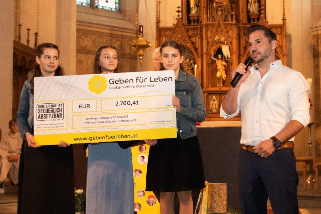 Am 5. Mai durften die Schwarzach Firmlinge bei ihrer Firmung den Scheck mit dem großartigen Betrag von € 2.760,41 an Manuel Kussian (GfL) überreichen. Die 38 Jugendlichen durften im Rahmen der Firmvorbereitung erfahren, dass man durch viele kleine Dinge Großes erreichen kann. Mit ihrem Einsatz können zahlreiche Typisierungen finanziert werden, die zu 100% durch Geldspenden abgedeckt werden müssen.