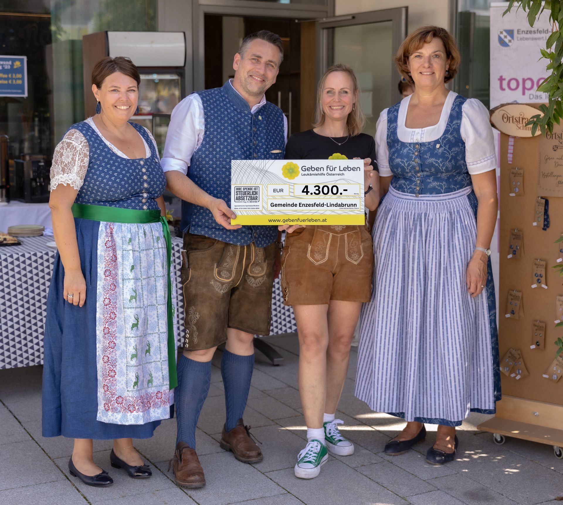 Der Erlös aus der Tombola, dem Verkauf der Trachtenpärchen-Kluppen und Mehlspeisen, kam „Geben für Leben“ zugute. Im Rahmen einer Scheckübergabe wurde der großartige Betrag von € 4.300.- feierlich überreicht. Vielen herzlichen Dank für diese wertvolle Unterstützung! Mit dieser Geldspende können wieder weitere Typisierungen finanziert werden.