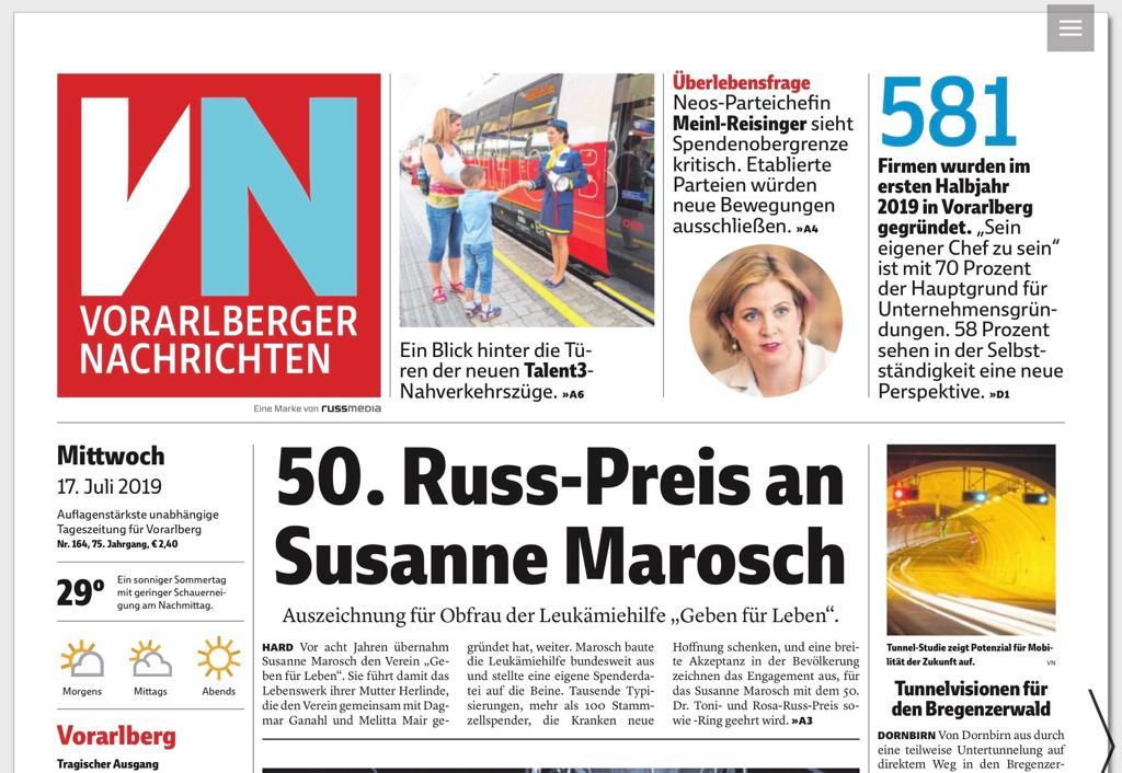 Ich freue mich sehr und fühle mich sehr geehrt, bekannt geben zu dürfen, dass mir von Russmedia der Dr-Toni-und-Rosa-Russ-Preis 2019 verliehen wird. Die offizielle Verleihung mit Festakt findet am 2. September 2019 im Festspielhaus in Bregenz statt.