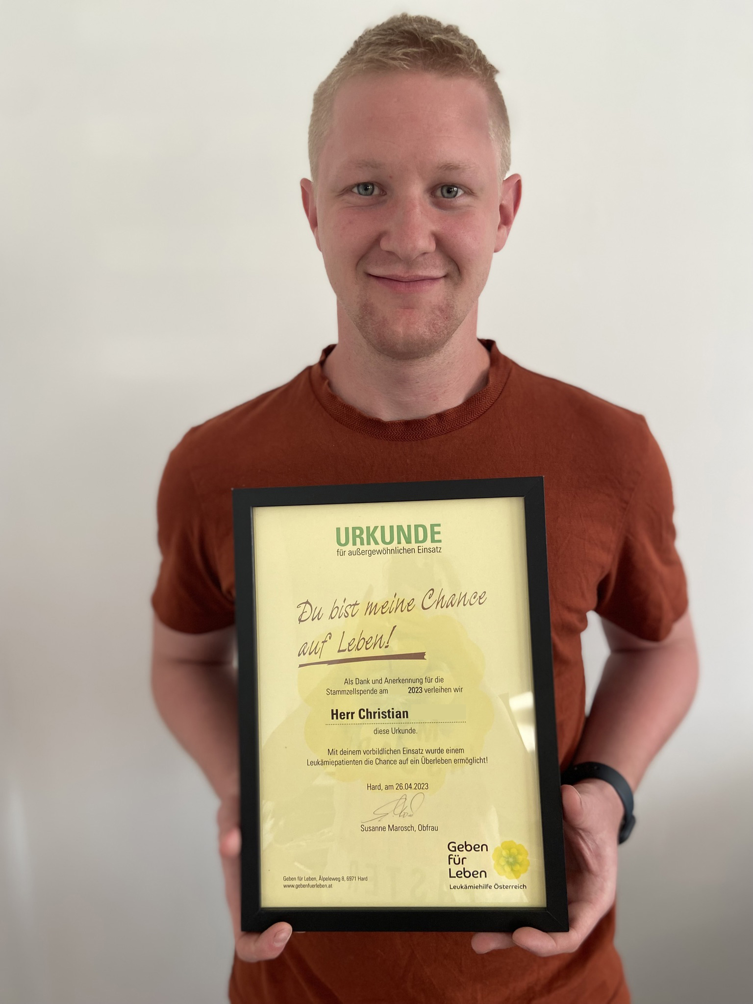Bild: Unser Spender Christian mit seiner Lebensretterurkunde - Download Foto