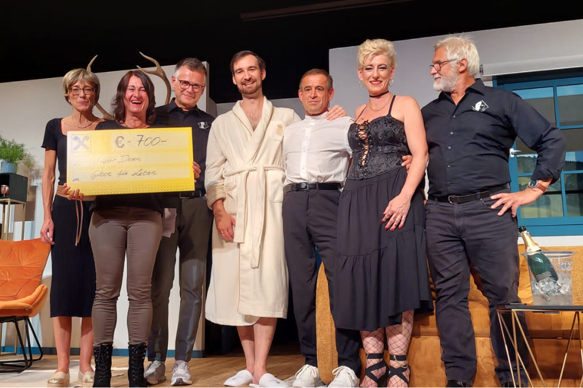 Seit vielen Jahren unterstützt die Theatergruppe Doren Geben für Leben bei der Premiere und spendet die Eintrittsgelder. Nun konnte die engagierte Truppe nach langer Corona-Pause endlich wieder mit einer wunderbaren und vor allem freizügigen Aufführung das Publikum begeistern. Dank der Aufführung „Zwei Männer ganz nackt“ und des unermüdlichen Einsatzes konnten € 700 an Obfrau Susanne Marosch übergeben werden. Ein herzliches Dankeschön an die Theatergruppe Doren für die jahrelange wertvolle Unterstützung.