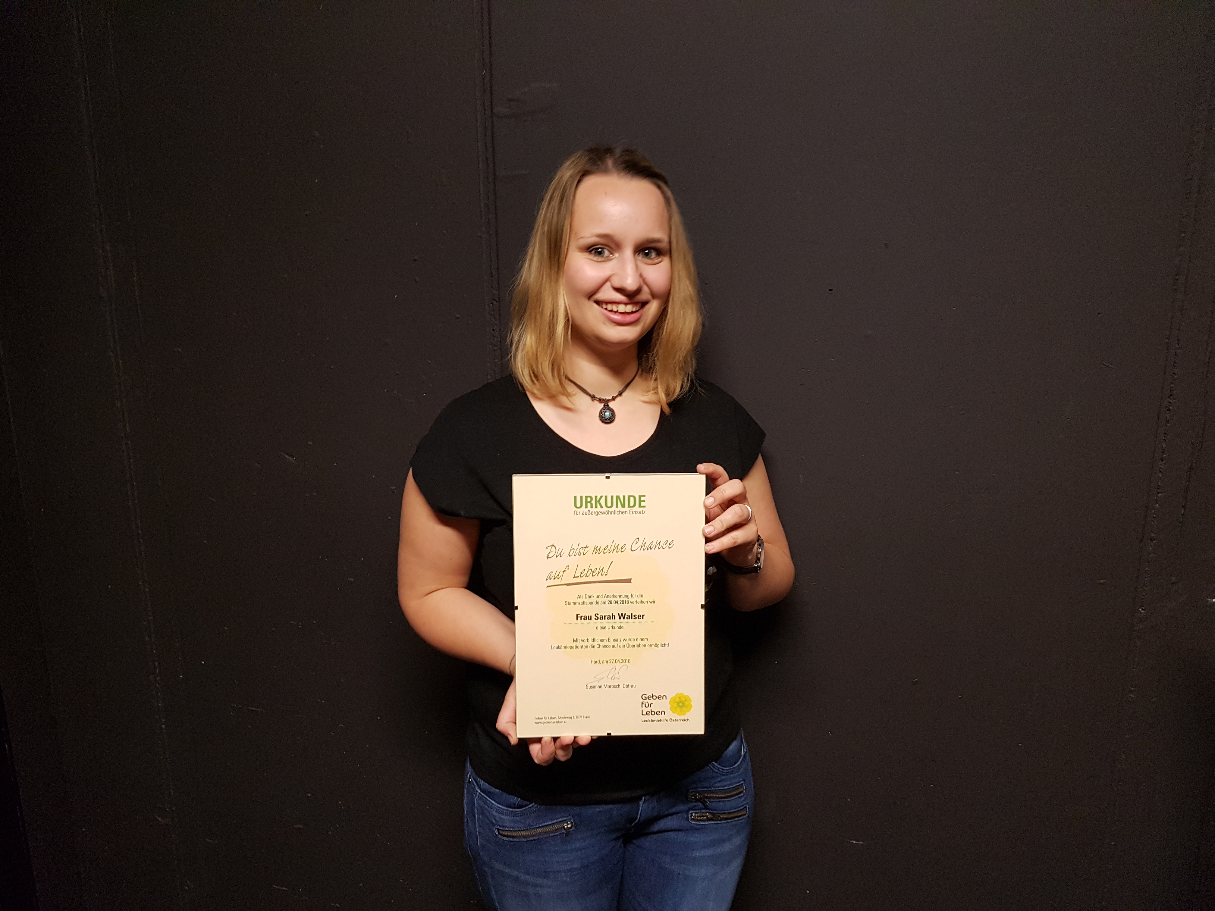 Vielen Dank Sarah für dein fantastisches Engagement. Du hast einer Familie große Hoffnung auf das Überleben eines geliebten Menschen geschenkt!