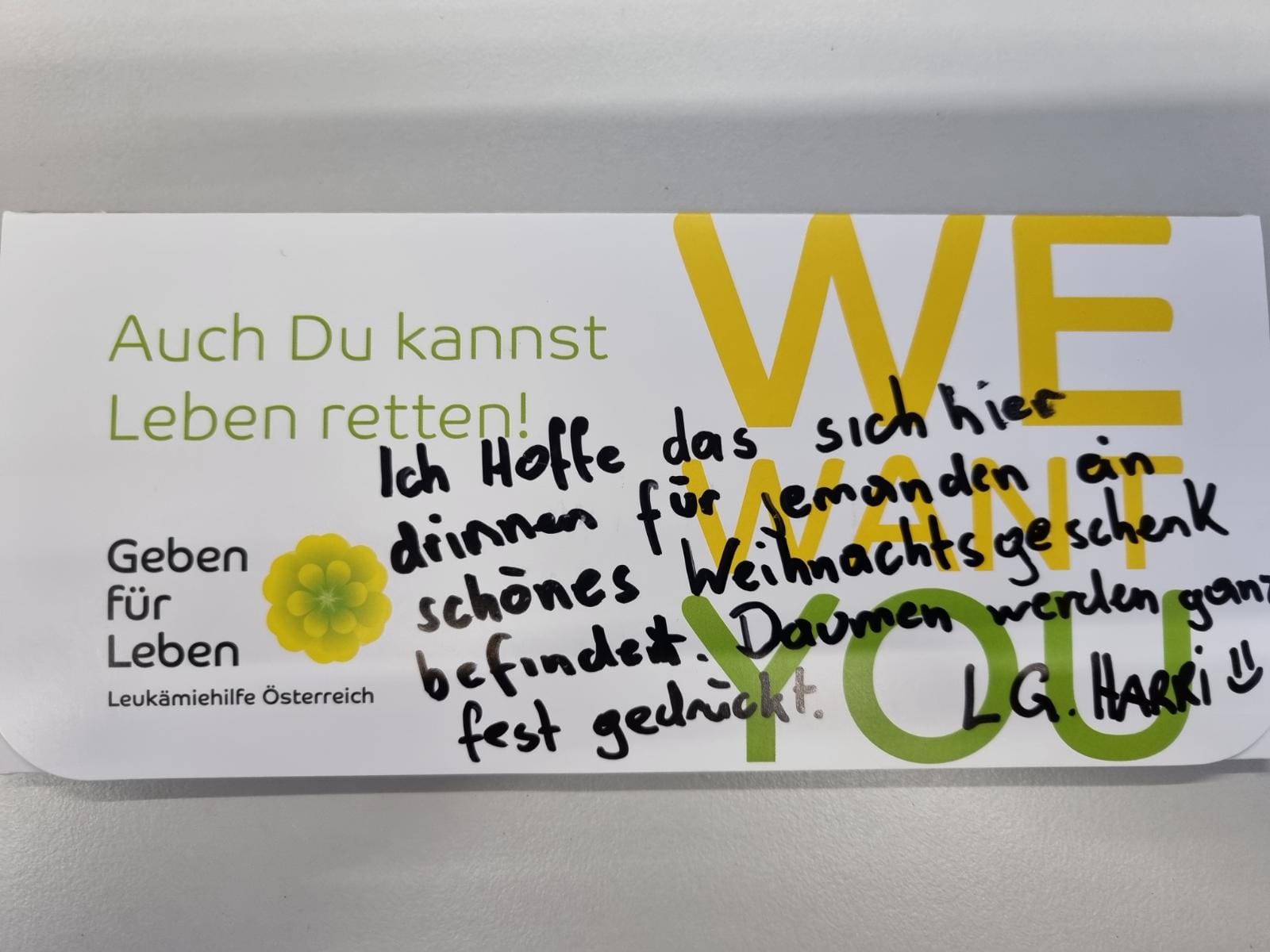 Manche Menschen schaffen es immer wieder mal, uns mit kleinen Gesten zu berühren. So wie Harri, der auf seinem Kuvert des durchgeführten Wangenabstrichs eine Nachricht an unser Team mitsendete: