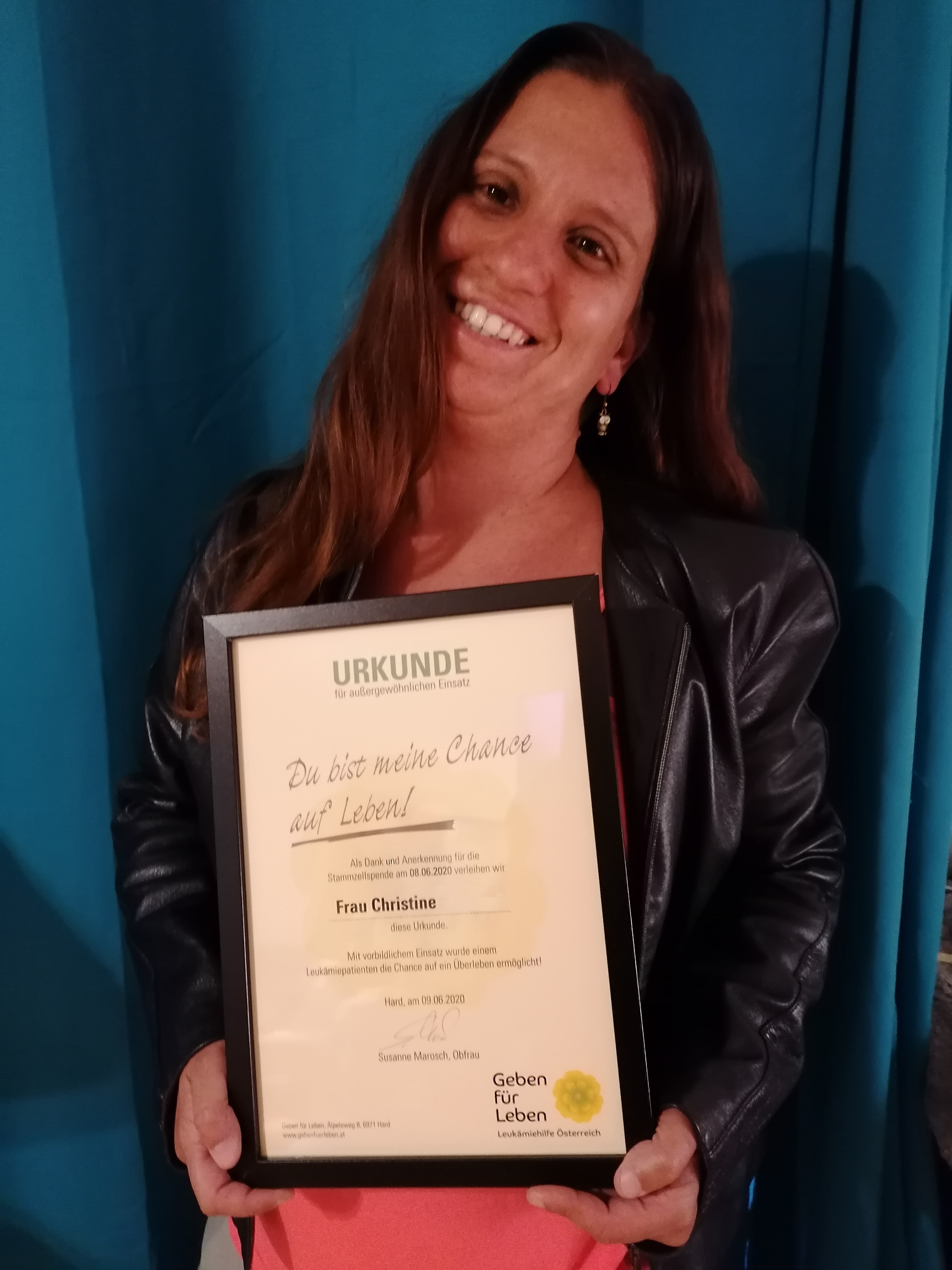 Bild: Unsere 178. Lebensretterin Christine mit ihrer Lebensretterurkunde - Download Foto