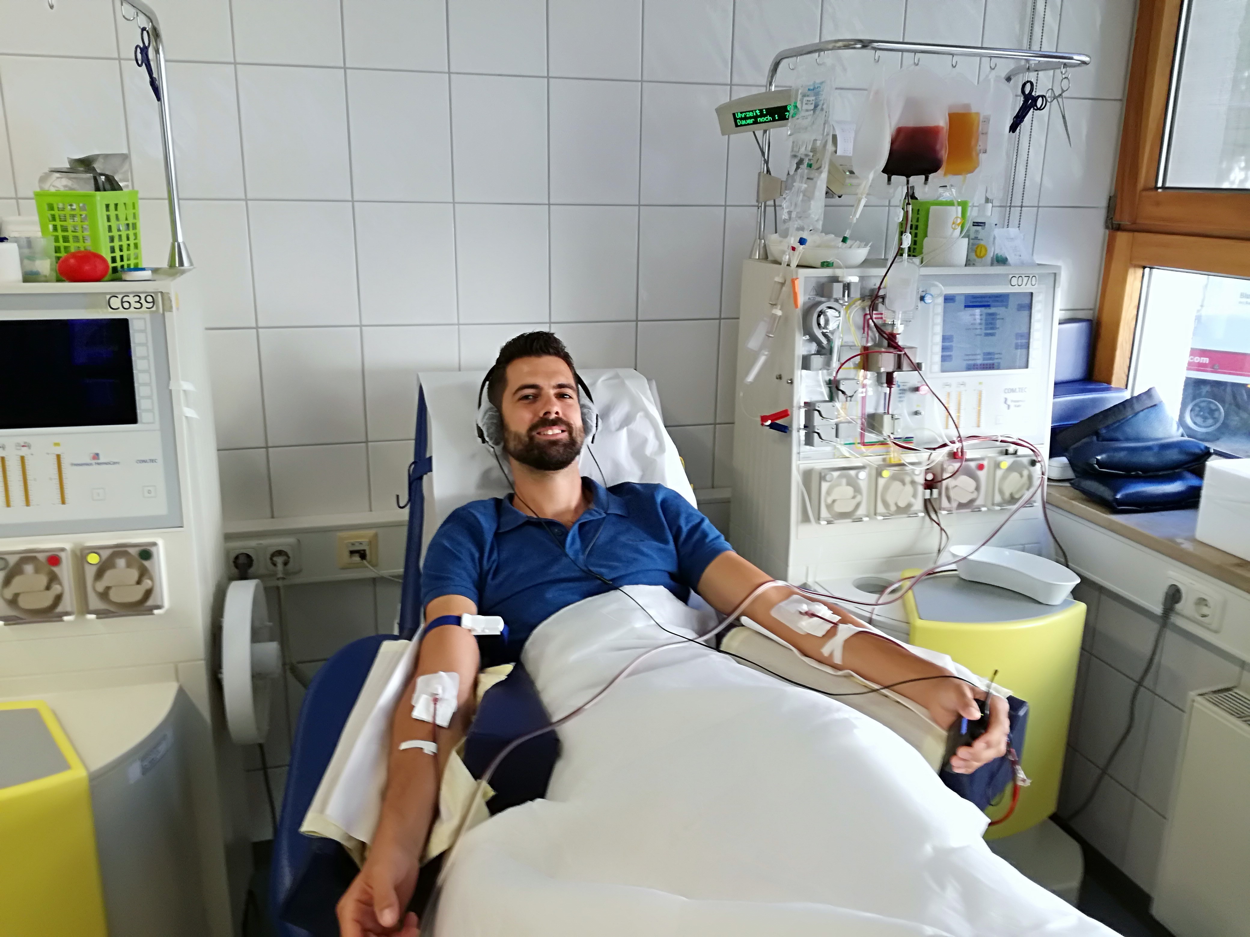 Ein Jahr später war es dann soweit. Nach unserem Anruf wurde er in einer ausgiebigen Voruntersuchung gründlich durchgecheckt und dann für die Spende freigegeben. Bei der Vorbereitung hatte er Gliederschmerzen, die aber gut auszuhalten waren. Nur die begleitende Müdigkeit war lästig.