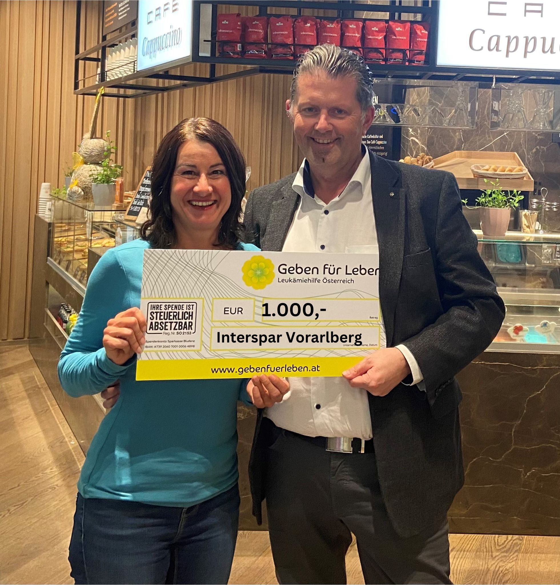 Wir erhielten eine großartige Unterstützung von Interspar Vorarlberg. Regionaldirektor Andreas Mark überreichte einen Scheck über € 1.000,- an Susanne Marosch. Zudem ermöglicht er uns zukünftig, auch Typisierungsaktionen in verschiedenen Einkaufszentren in Vorarlberg und Tirol durchzuführen.