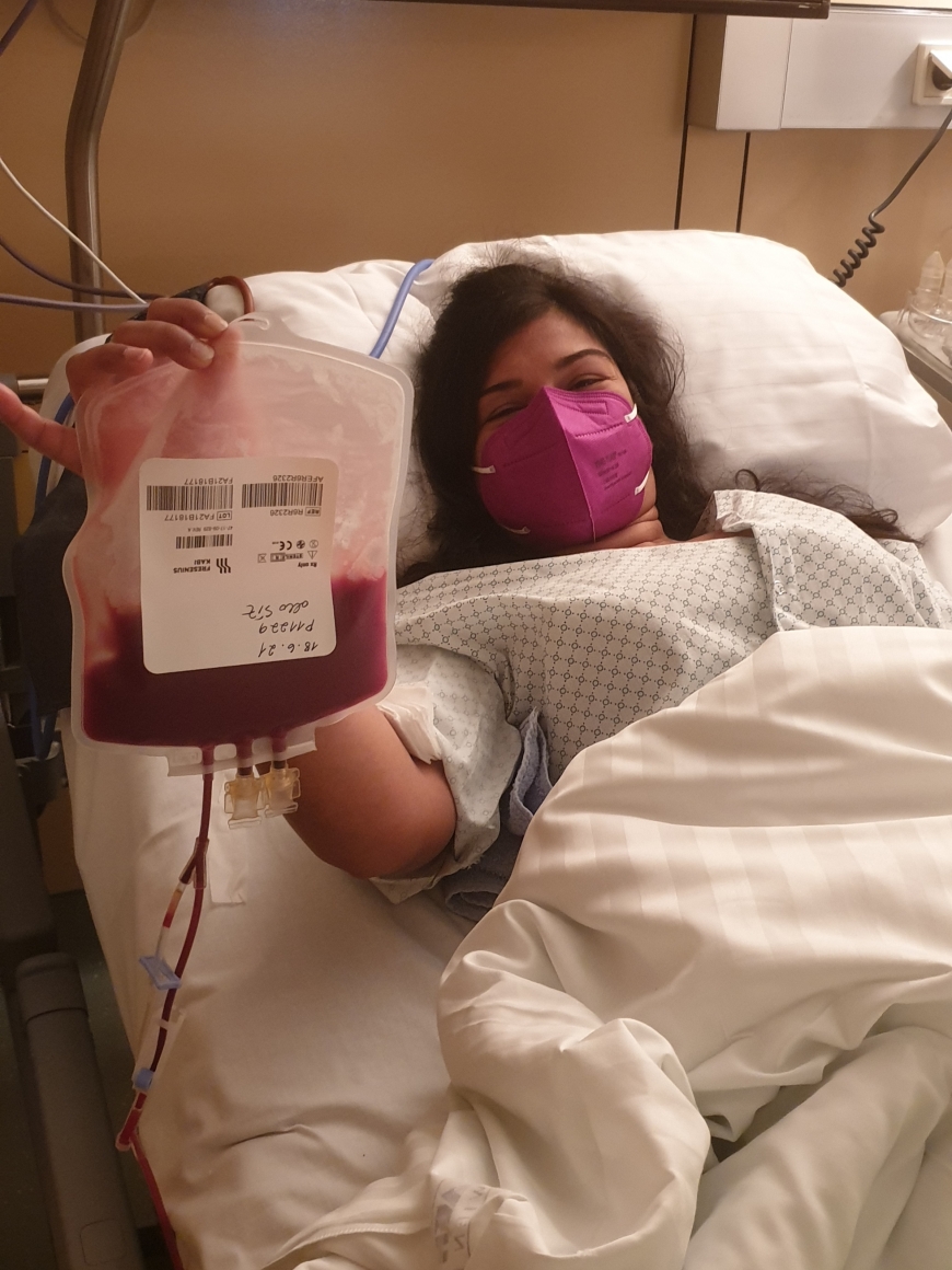 Die Stammzellspende am 18.Juni 2021 war eine meiner besten Erfahrungen, da ich enorm daran gewachsen bin. Ich musste über sämtliche meiner Schatten springen (Spritzen u. Nadelphobie). Aber am meisten war es besonders, weil ich meinem Vater meine Liebe endlich auch zeigen konnte. Die enorme Wichtigkeit dieser Stammzellspende ließ meine Angst sehr klein aussehen. Durch die eigene mentale Vorbereitung war ich für die gesamte Zeit von der Vorbereitung bis zur Stammzellspende (ca. 5 Tage) wie ausgewechselt. Ich war ja nicht nur Stammzellspenderin, sondern auch enge Angehörige, die über die ganze Zeit davor und auch danach durchgehend mitzitterte.