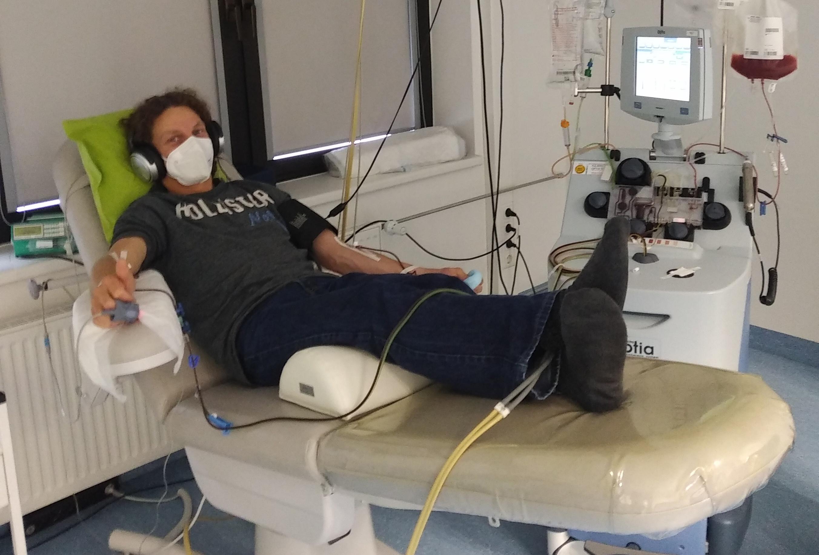 Nun ging alles wirklich schnell. Als ich in den Raum gebeten wurde, wo die Apherese stattfand, waren bereits zwei weitere Spender mit den Apheresegeräten verbunden. „Einmal bitte Platz nehmen“. Noch einmal wurde Blut für das Labor abgenommen, danach wurde ich links und rechts in den Armvenen mit dem Apheresegerät verbunden. Die Funktionsweise des Apheresegerätes kann man mit einer Art Zentrifuge vergleichen, in welcher die Blutbestanteile voneinander getrennt werden können. In meinem Fall also Stammzellen und Blutplasma.