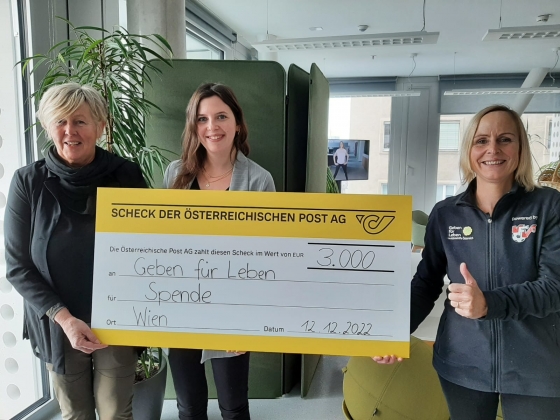 Jede Typisierung kostet den Verein „Geben für Leben“ € 40.-. Diese Kosten übernahm die Österreichischen Post AG für ihre Mitarbeiter. Im Zuge einer Scheckübergabe mit Ursula Bachmair und Julia Tagwerk wurde die wertvolle Unterstützung über € 3.000 Spende übergeben. Danke vielmals dafür!
