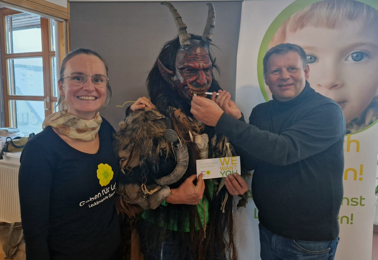 Am 9. Dezember lud der Bürgermeister der Gemeinde St. Konrad Herbert Schönberger zu einer Typisierungsaktion in das Gemeindeamt. Es blieb uns nicht verborgen, dass er sehr fleißig die Werbetrommel für unsere Aktion rührte. So ließen sich neben dem Krampus auch 98 weitere Menschen typisieren. Außerdem sammelten wir gemeinsam über € 900 an Spendengelder.