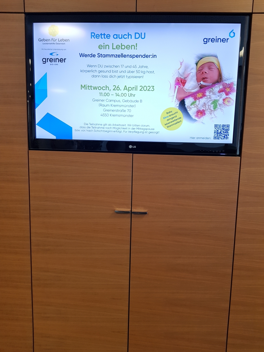 Am 26. April 2023 führten wir am Greiner Campus in Kremsmünster (OÖ) gemeinsam mit unserem Kooperationspartner "Greiner Bio-One" eine weitere Typisierungsaktion durch. Baby Elina sucht nach wie vor dringend einen Stammzellspender. 40 MitarbeiterInnen am Greiner Campus und von den umliegenden Greiner Standorten haben sich dem Aufruf angeschlossen.